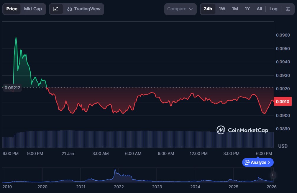 Currently valued at $0.09103, CRO’s market capitalization reaches $3.62 billion, while its trading activity over the past 24 hours totals $28.82 million.