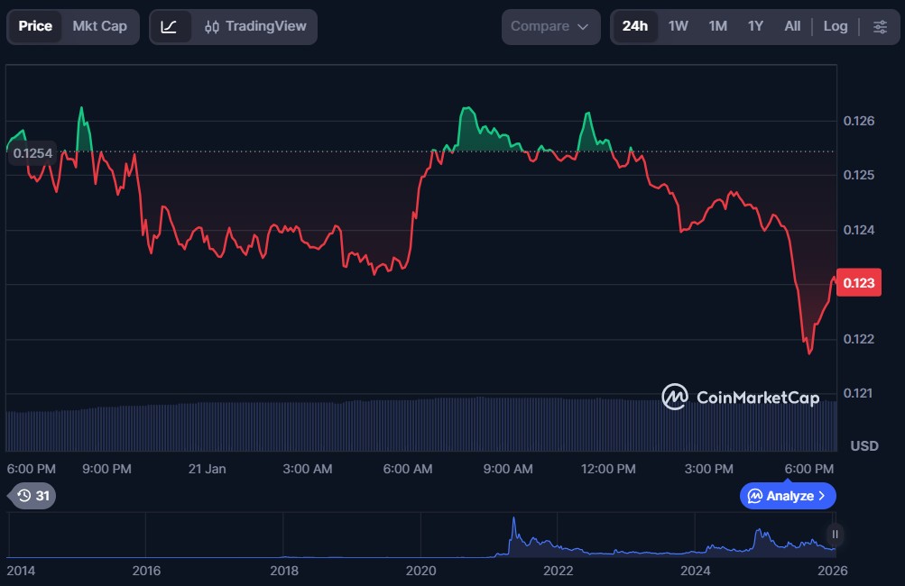 At the time of writing, DOGE is trading at $0.1230, with a market capitalization of $20.71 billion and a 24-hour trading volume of $1.30 billion.