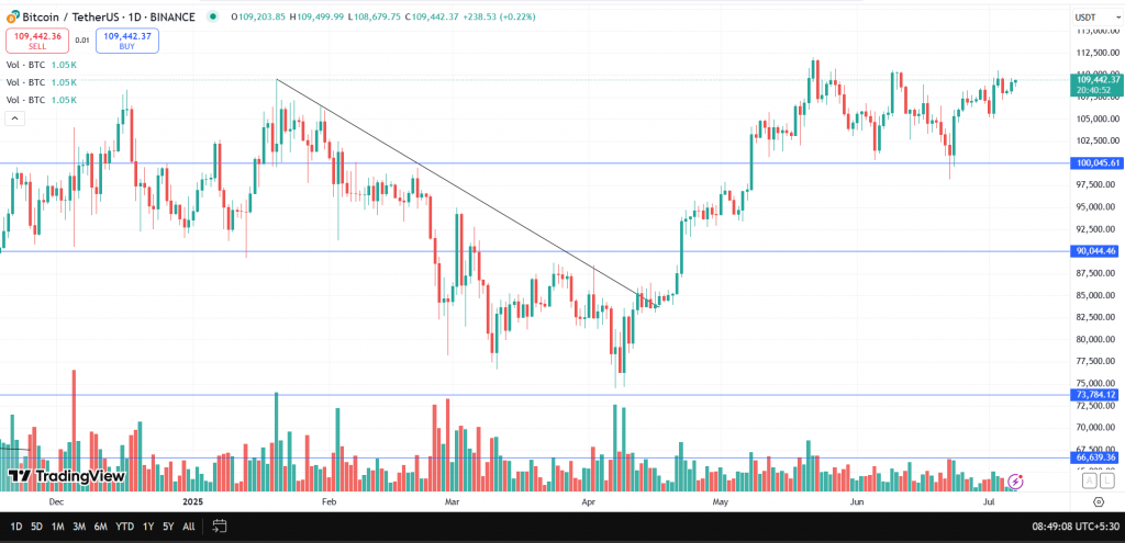 Bitcoin has been consolidating within a narrow range for the past seven weeks, building anticipation around its next major move. During this time, its dominance in the overall crypto market has risen steadily, surpassing 65%—its highest level since early 2021. This growing strength is also reflected in institutional interest, with spot Bitcoin ETFs witnessing $1 billion in net inflows over just two days. However, investor sentiment remains cautious amid rising geopolitical tensions and the looming risk of a global trade war, particularly following President Trump’s reaffirmation of an upcoming tariff hike deadline.