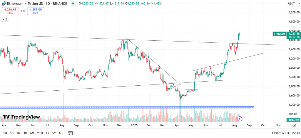 Risk factors include potential pullbacks if ETH fails to clear $4,350 decisively. A rejection at current levels could lead to a retest of $4,150 support, while a break below $4,000 would signal a more significant correction toward the $3,800 zone.