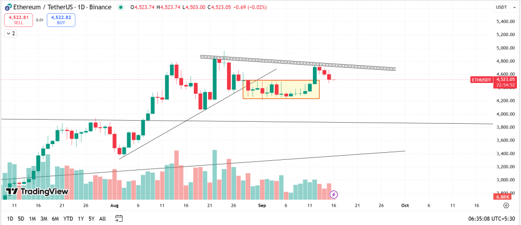 ETH remained in a consolidation zone for 14 days. After taking support at $4,238, it resumed its uptrend and broke out of the consolidation range. However, ETH showed a fake breakout and started a downtrend from the $4,774 level. Once it crosses the resistance trendline, a strong up move toward new ATH levels is likely. On the downside, strong support lies near $4,200—if this level breaks, the downtrend could extend further.