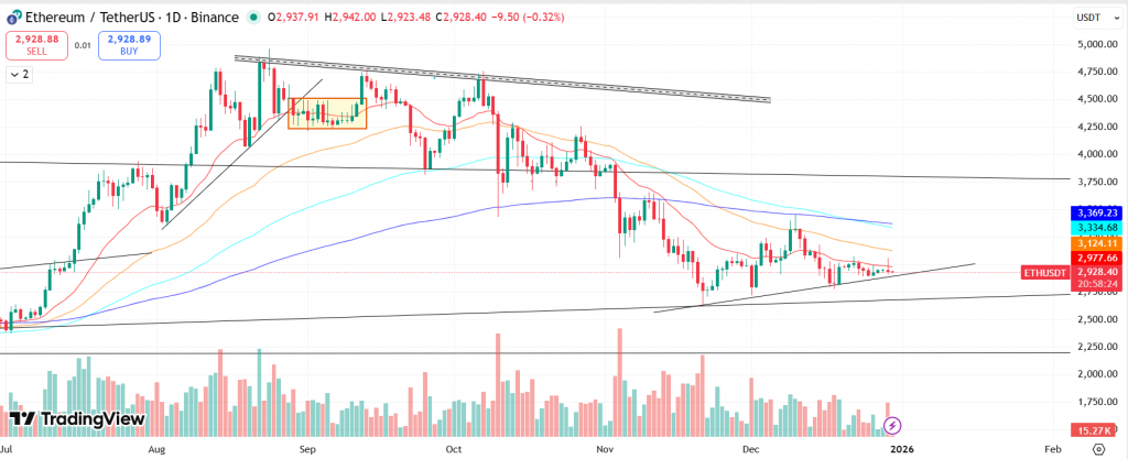 Ethereum remains in a tight consolidation zone, facing descending resistance while holding above critical support. A breakout above $3,100 could open room toward $3,370, whereas a drop below $2,900 may accelerate downside toward $2,750. Market sentiment, liquidity conditions, and volume will guide price direction into early 2026. Watching EMA interactions and volume spikes will be key for identifying trend reversals.