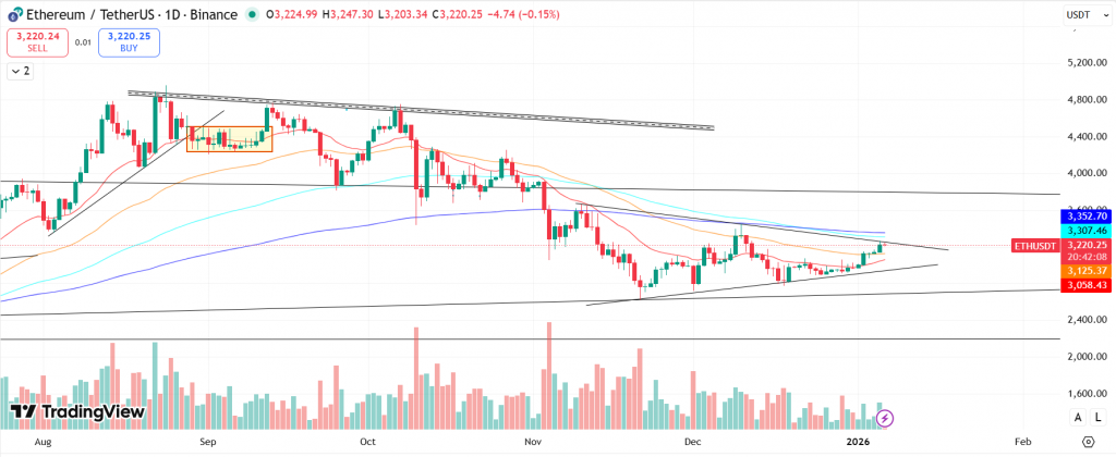 Summary: ETH is trading within a tightening structure, supported by a rising trendline from 21st November while facing rejection from long-term descending resistance. The short-term bias is improving, but price remains below major moving averages, keeping the broader trend corrective. A sustained breakout above the $3,300 zone could trigger further upside, while a breakdown below $3,000 would weaken the current structure and expose lower supports.