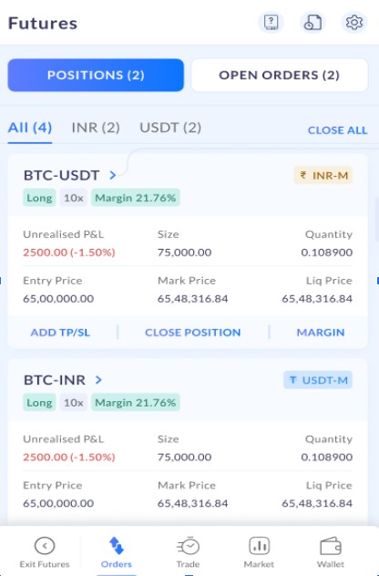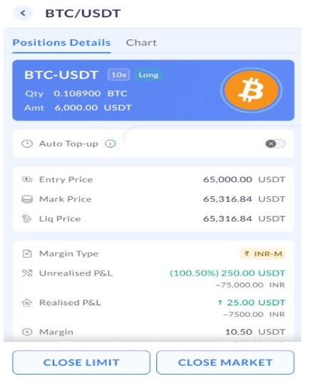 1. Visit the ZebPay website, log in, and go to Futures. Navigate to Positions and select the trade you want to enable Auto-Top Up for, such as BTC-USDT.