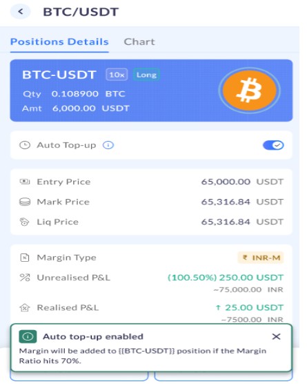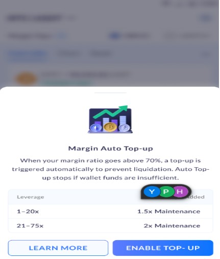 The Auto Top-up feature automatically adds margin to your open position when it’s close to liquidation. This ensures that your trade remains active and protected against sudden market swings without the need for constant manual intervention.