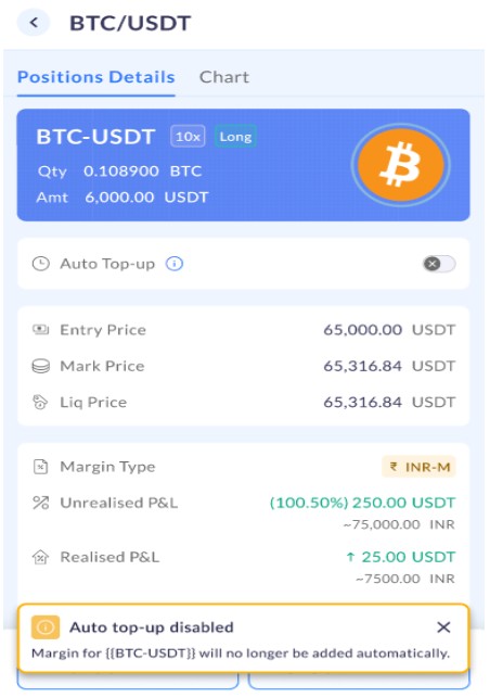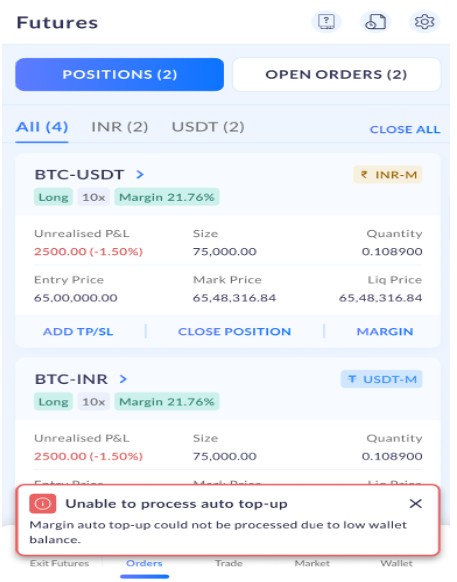 6. In case your wallet balance becomes insufficient, Auto Top-Up will automatically pause, with a confirmation pop-up stating that – Auto top-up has been stopped for {{BTC-USDT}} due to low wallet balance.
