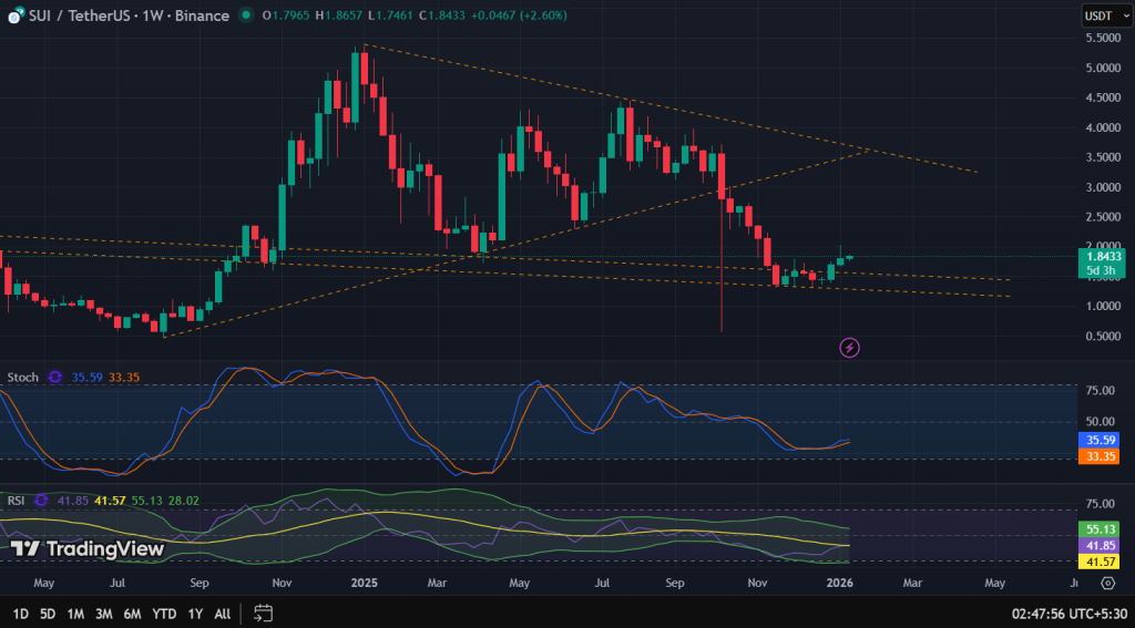 On the weekly chart, the SUI price is trading above its Simple Moving Average (14 and 21 periods) levels of $1.8302 and $1.8236, indicating a potential continuation of the upward trend in the coming sessions.