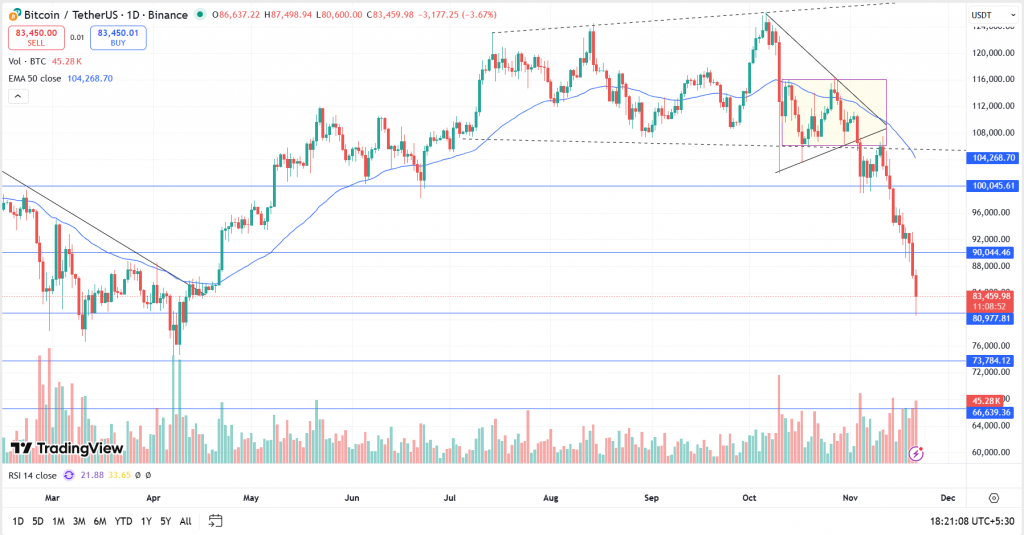 BTC, after making a new all-time high of $126,199, witnessed a sharp fall and the price plunged almost 20% to $102,000. Post this move, the asset was trading in a range between $116,000 and $107,000, forming a Symmetrical Triangle Pattern. BTC gave a breakout below the range and plunged another 25%, making a low of $80,600. The asset has strong support at $80,000. If it holds and sustains above this level, we may expect a relief rally toward $90K. If the price breaks and closes below the support, further downside could follow, with the next support around $73,000.