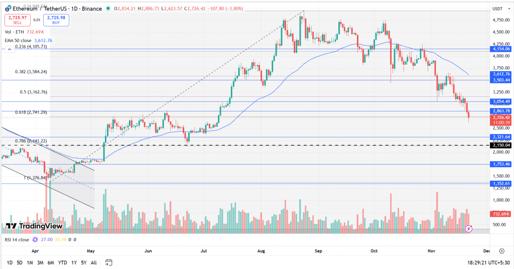 ETH, after making a new all-time high of $4,956, witnessed a sharp fall as the price plunged almost 39% to $3,054. The asset attempted to take support at the psychological level of $3K and started consolidating in a range. ETH eventually gave a breakout below the range, and the price made a recent low of $2,623. The asset has support at $2,740 (61.8% Fibonacci Retracement Level). If it holds and sustains above this support, we may expect a relief rally toward $3,000. However, if it closes below the support, it may test the next support zone at $2,500 to $2,350.