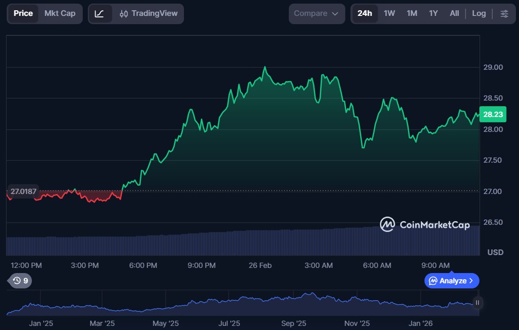 | Hyperliquid (HYPE) | $28.23 | $7.29 billion | $343.92 million |