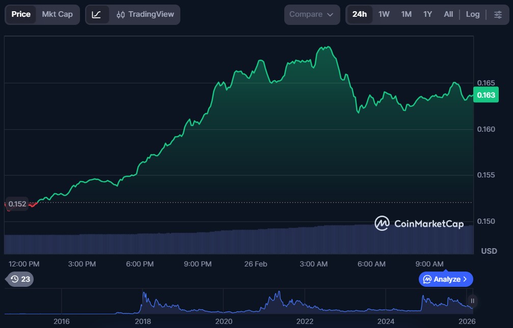 | Stellar (XLM) | $0.1631 | $5.38 billion | $148.69 million |