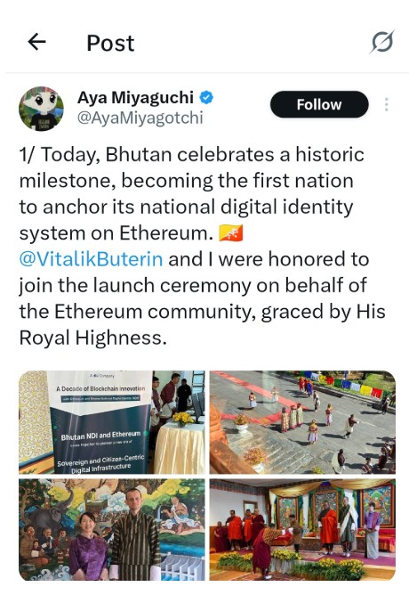 According to Aya Miyaguchi, Ethereum Foundation President, the National ID System integration process is completed and residents are expected to finish migrating by the first quarter of next year. Co-Founder of Ethereum Vitalik Buterin joined the President of Bhutan at the launch ceremony.