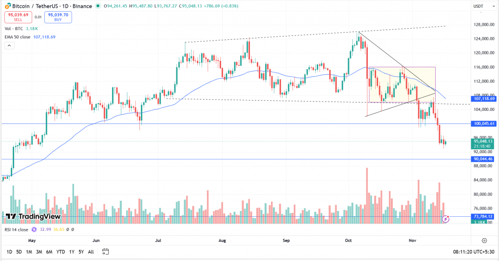BTC, after making a new all-time high of $126,199, witnessed a sharp fall as the price plunged almost 20% to $102,000. Following this move, the asset traded in a range between $116,000 and $107,000, forming a ‘Symmetrical Triangle’ pattern. BTC gave a breakout below the range and made a low of $93,005. The asset has a strong support zone between $92,000 and $90,000. If it holds and sustains above this support, we may see some recovery, whereas a break and close below it could lead to further downside.