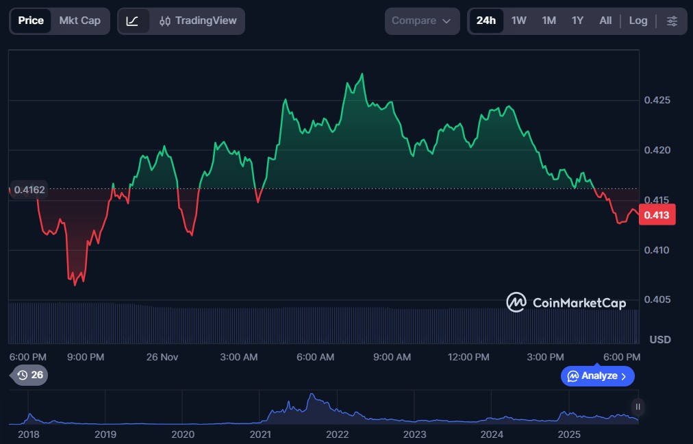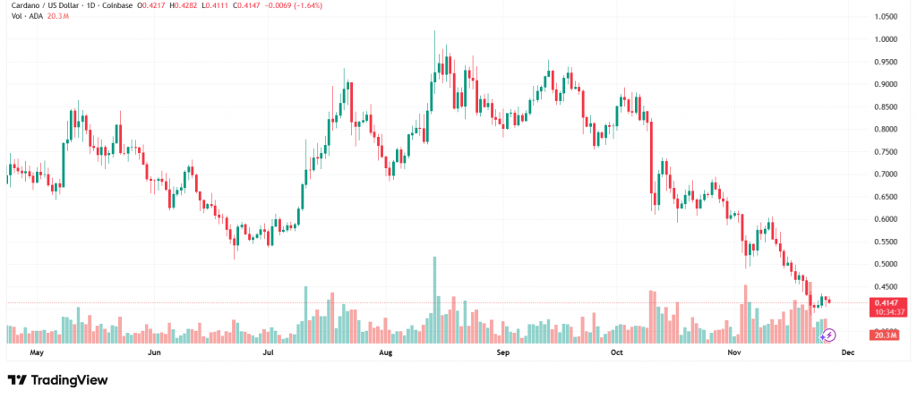 Currently, ADA is trading at $0.4146, giving it a market capitalization of around $14.87 billion. On the daily chart, its Relative Strength Index (RSI) sits at 29.2409. Out of the total 45 billion ADA supply, approximately 35.89 billion coins are already in circulation.