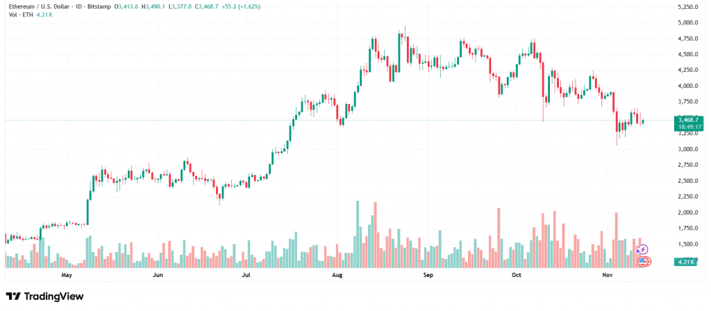 Ethereum is currently trading around $3,477.82, with a circulating supply of approximately 120.69 million coins and a market capitalization close to $419.62 billion. These figures reaffirm its standing as the second-largest force in the global crypto market.