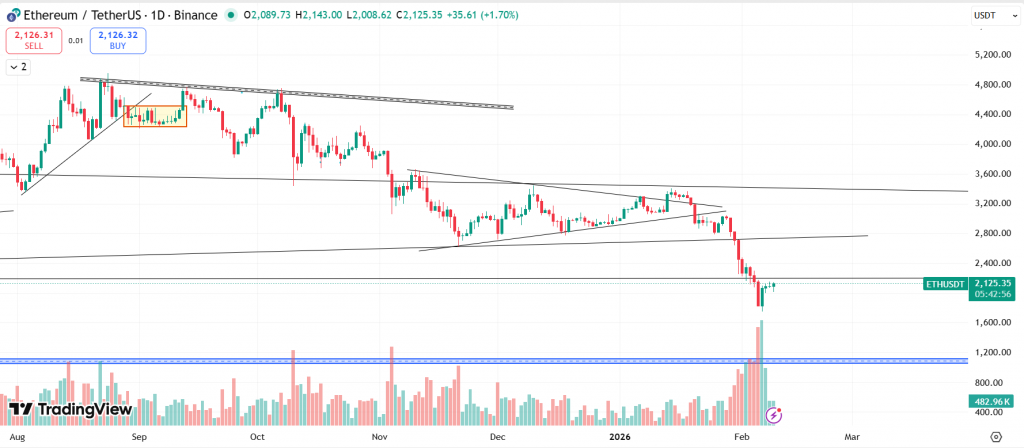 ETH is in a confirmed bearish market structure on the daily timeframe after breaking the major support at $2,200.