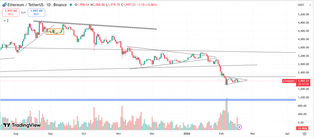 For a bullish scenario to gain traction, ETH must break above the triangle resistance and reclaim the $2,200 level with strong daily closes supported by rising volume. Without this confirmation, any upside movement is likely to remain a short-term relief rally within a broader downtrend.