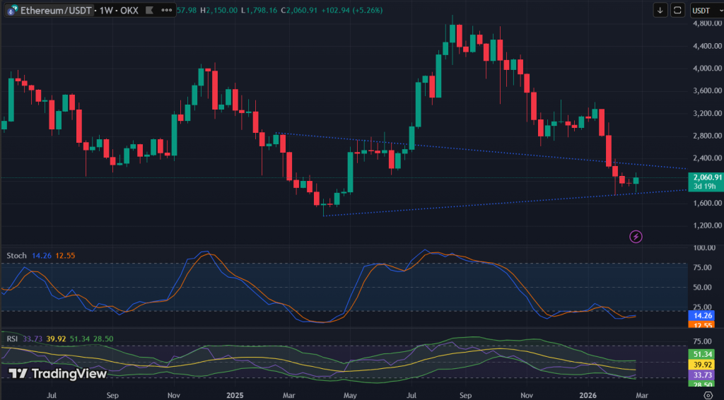 On the weekly chart, ETH is trading at $2,060.91, having witnessed a sharp decline from the $3,300 level and recently hitting a low of $1,744.