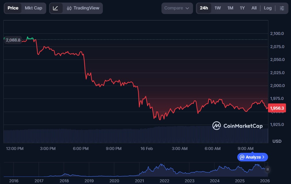 | Ethereum (ETH) | $1,956.89 | $236.17 billion | $26.30 billion |
