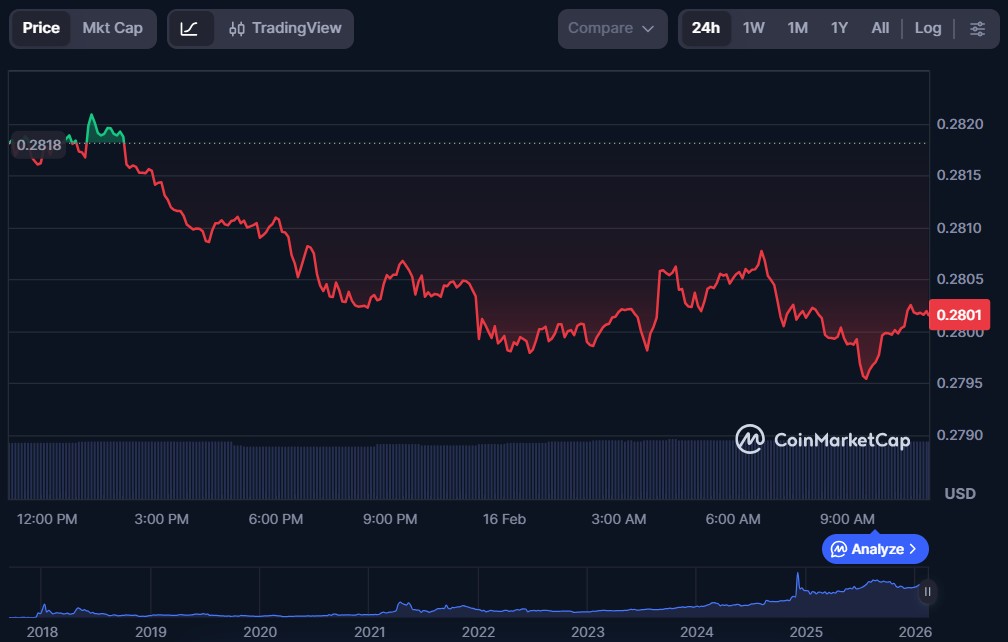 | TRON (TRX) | $0.2801 | $26.53 billion | $472.96 million |