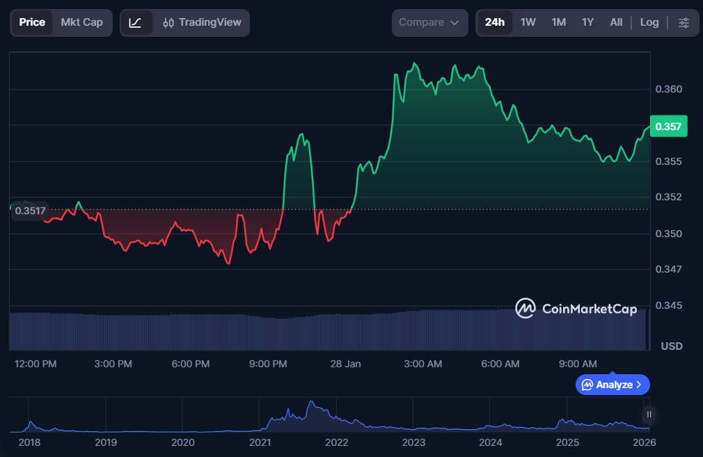 | Cardano (ADA) | $0.3574 | $12.88 billion | $487.55 million |