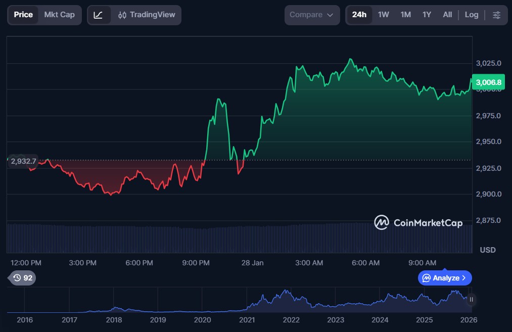 | Ethereum (ETH) | $3,006.75 | $362.89 billion | $26.18 billion |
