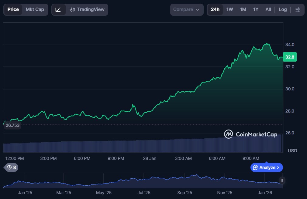 | Hyperliquid (HYPE) | $32.88 | $9.93 billion | $832.18 million |