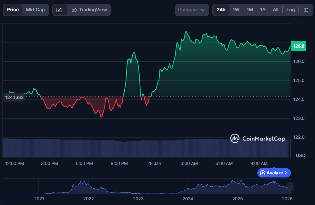 | Solana (SOL) | $126.84 | $71.81 billion | $3.60 billion |