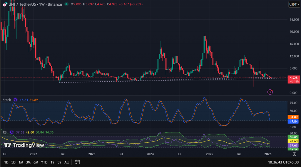 UNI has a market cap of $3.12 Bn as of date, and the overall crypto market cap stands at $3.02T. On the weekly chart, UNI formed a recent low of $4.620, hit a lower support level, and bounced, indicating buying interest at lower levels. On the downside, strong support is seen at the $4.012 level.
