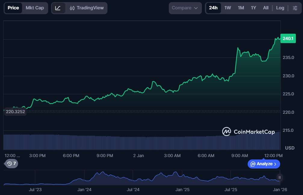 | Bittensor | $240.14 | $2.53 billion | $78.17 million |