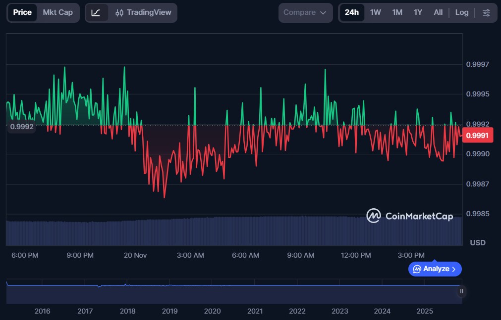 At the time of writing, USDT was trading near $0.9991, with a market capitalization of roughly $183.73 billion.